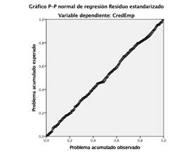 - Normalidad: Se cumple, pues la regresión del residuo tipificado en relación a la variable dependiente traza un gráfico de distribución normal (figura 2), así como el alineamiento en diagonal del residuo tipificado (Figura 3).