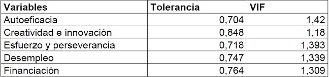 - No colinealidad: Se cumple si no existe relación lineal entre ninguna de las variables independientes. En nuestro caso, todos los valores de tolerancia están entre ,704 y ,848; y los factores de inflación de la varianza (FIV) entre 1,309 y 1,420 (tabla 1).
