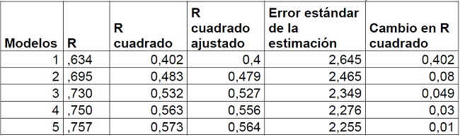 La investigación utiliza la técnica de la regresión múltiple por pasos sucesivos, introduciendo las variables con mayor beta y más significativas, para luego observar los cambios en el R cuadrado del modelo.