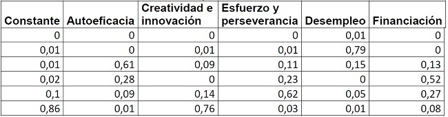 O lo que es lo mismo, la combinación de percepciones de deseabilidad y de viabilidad al emprendimiento. Siendo nuestro modelo capaz de detectar la combinación de factores necesarios para que un estudiante tenga un comportamiento emprendedor creíble.