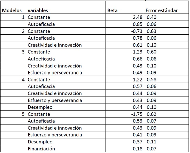 Credibilidad Emprendedora = -1,75 + 0,53 Autoeficacia + 0,43 Creatividad e innovación + 0,41 Esfuerzo y perseverancia + 0,37 Desempleo + 0,18 Financiación