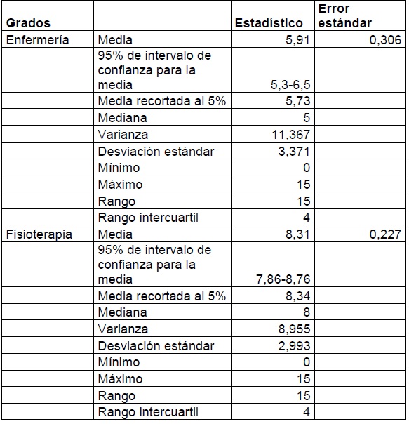 Además, si observamos los datos estadísticos descriptivos (tabla nº8), podemos afirmar que el colectivo de estudiantes de fisioterapia es más emprendedor. En concreto, su media es de 8,31, y su desviación estándar de 2,993. Todo lo contrario que los estudiantes de enfermería, que obtienen una media más baja (5,91), y una desviación estándar más elevada (indicando mayor dispersión de los resultados).