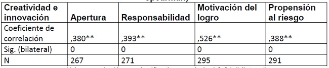 La variable creatividad e innovación se define como el estado de alerta hacia nuevas oportunidades. El sujeto creativo e innovador es capaz de detectar nuevas oportunidades, que han pasado desapercibidas por el resto. Para Athayde 23, las personas creativas son los percusores del comportamiento innovador. La correlación entre innovación y emprendimiento es significativa, siendo especialmente fuerte como percepción de viabilidad 13)(24)(25. En nuestro estudio, la variable obtiene una Beta (=.43) elevada, que indica su influencia directa con la credibilidad emprendedora del sujeto. Este dato significativo lo podemos complementar analizando el efecto de correlación con otras variables de percepción de deseabilidad respecto a la creatividad e innovación (tabla nº9). En este sentido, la motivación del logro (Rho=.526) se define como el deseo del sujeto por mejorar los resultados de la acción, y sentirse responsable de los mismos. Se trata de un deseo personal de competición hacia el máximo nivel de excelencia, buscando la mejor manera de hacer el trabajo, y siendo algo muy importante para el sujeto. En una línea parecida encontramos la variable responsabilidad (Rho=.393), concepto que tiene relación en ser diligente, bien organizado, persistente y orientado a objetivos y resultados 14. Y la variable apertura (Rho=.380), siendo las personas abiertas tendentes a ser más creativas, originales y receptivas a nuevas experiencias; especialmente en distintos y variados intereses 14. Es de hecho la originalidad y la creatividad, los factores que más correlacionan con el emprendimiento, porque son el preludio de la innovación 23.