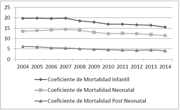 El CMI tuvo una caída de 19.7 en 2004 a 15.5/1.000 NV, en 2014, que representa una disminución de 21.3%. El componente post neonatal era principalmente responsable de esta disminución, pasando de 6.2 a 4.1/1000 NV entre 2004 y 2014, que representa un descenso del 33,3%. El componente neonatal registró un descenso del 15,8%, durante el periodo estudiado, en el que el coeficiente disminuyó de 13,5 a 11.4/1000 NV (Figura 1).