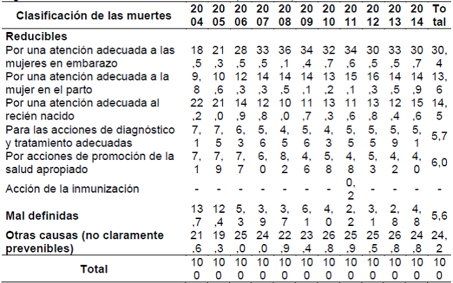 Se observa en la Tabla 1, que, en el período bajo examen, la mayoría de las muertes infantiles evitables podrían reducirse si se realizaran acciones de salud más efectivas durante la atención a la mujer en embarazo (30,4%), asistencia al recién nacido (14,5%) y a la mujer en el parto (13,6%). Con respecto a otras causas, 24.2% fueron caracterizadas como claramente no prevenibles y 5,6% de las muertes se caracterizó como causa mal definida.