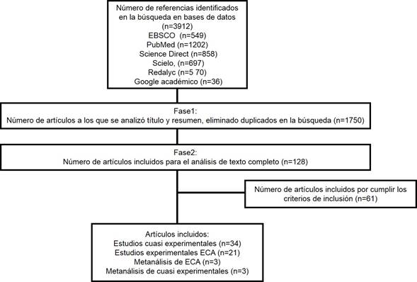 La búsqueda de artículos se realizó en las siguientes bases de datos: EBSCO, PubMed, Science Direct, Scielo, Redalyc y Google académico. Se utilizaron descriptores DeCS y mesh, a partir del uso de palabras claves para la búsqueda de los estudios relacionados con el fenómeno de interés para la presente revisión sistemática (RS); tales como: alcohol, intervención, adolescentes, alcohol use, alcohol consumption, adolescents, teenagers, intervention y los operadores boléanos AND y OR, obteniendo un total de 3,912 artículos, de los cuales 61 estudios fueron seleccionados por cumplir los criterios de inclusión. (Figura 1)