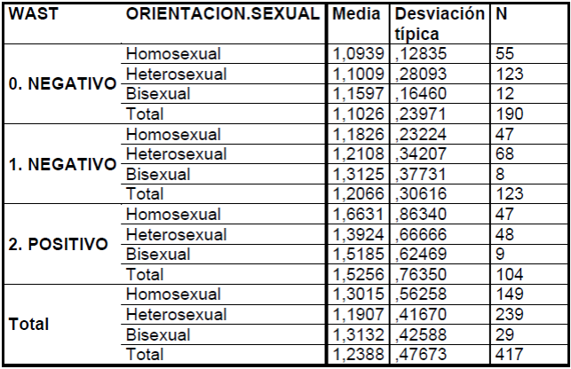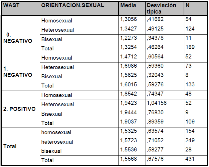 En cuanto a la violencia interpersonal y la orientación sexual se observaron a 431 sujetos, WAST 0 (Negativo):1.33(0.46; WAST 1 (Negativo): 1.60(0.59; WAST 2 (Positivo):1.90(0.89(p<0.0005) a mayor WAST mayor violencia Interpersonal. (Tabla I)