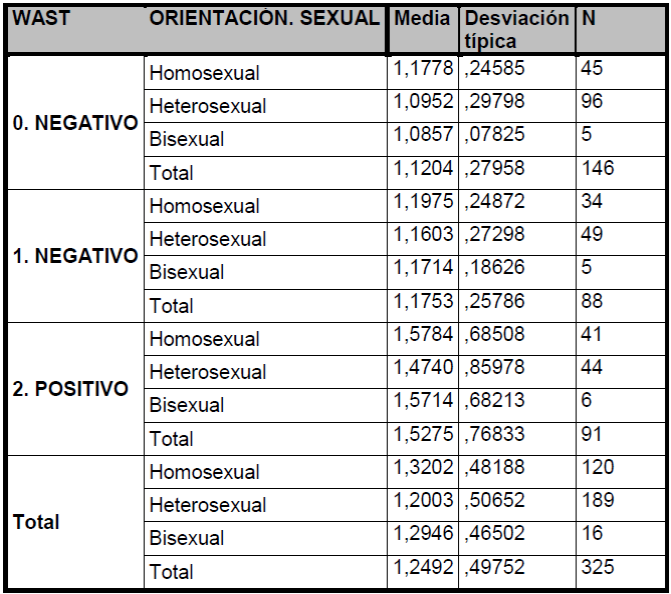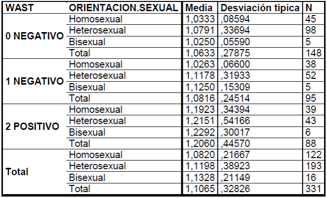 En cuanto a la Violencia Social y la Orientación Sexual se observaron a 325 sujetos, WAST 0 (Negativo):1.12(0.28; WAST 1 (Negativo):1.17(0.26; WAST 2(Positivo):1.53(0.77 (p<0.0005) a mayor WAST mayor violencia social. (Tabla II).