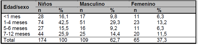 Los datos obtenidos señalaron que 109 (62,7%) de los participantes del estudio eran del sexo masculino y que 74 (42,5%) tenían entre 1 y 4 meses de edad conforme muestra la Tabla 1.
