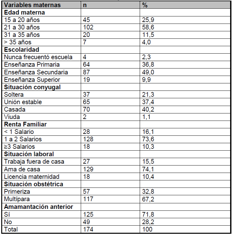 Considerando las variables maternas, se observó que 102 (58,6%) tenían entre 21 y 30 años, 87 (49%) cursaron enseñanza secundaria, 70 (40,2%) eran casadas, 128 (73,6%) tenían renta familiar entre 1 a 2 salarios mínimos, 129 (74,1%) eran dueñas de casa, 117 (67,2%) tenían más de 1 hijo y 125 (71,8%) ya habían amamantado anteriormente (Tabla 3).