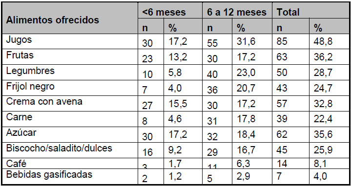 Entre niños de 6 a 12 meses, 55 (31,6%) recibieron jugos, 30 (17,2%) recibieron frutas, 40 (23%) recibieron legumbres, 36 (20,7%) recibieron frijol negro, 30 (17,2%) recibieron cremas con avena, 31 (17,8%) recibieron carne, 32 (18,4%) recibieron alimentos endulzados con azúcar, 29 (16,7%) recibieron bizcochos o saladitos, 11 (6,3%) recibieron café y 5 (2,9%) recibieron bebidas gasificadas (Tabla 4).