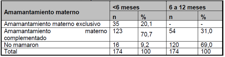 De los 174 niños estudiados 16 (9,2%) no recibieron AM. La prevalencia del AME hasta el sexto mes fue de 20,1% (35), y 123 niños además de leche materno recibieron otros alimentos antes del sexto mes. Entre los niños de 6 a 12 meses, 54 (31,0%) recibieron leche materna complementada por otros alimentos, 120 no recibieron más la leche materna, solamente otros alimentos (Tabla 5).