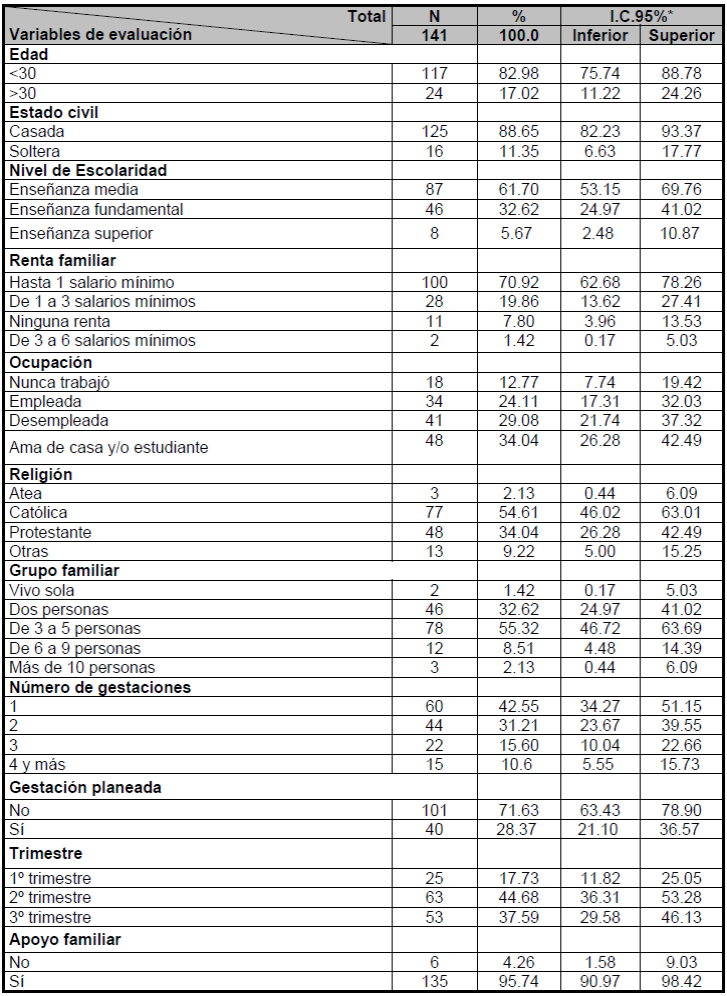 Participaron 141 gestantes en el estudio, en que la mayoría pertenece a la edad menor de 30 años (82,98%), están casadas (88,65%), estudiaron hasta la enseñanza media (61,7%), poseen una renta familiar de hasta un salario mínimo (70,92%), no ejercen actividad remunerada (34,04%), católicos (54,61%) y con grupo familiar constituido por 3 a 5 personas (55,32%).