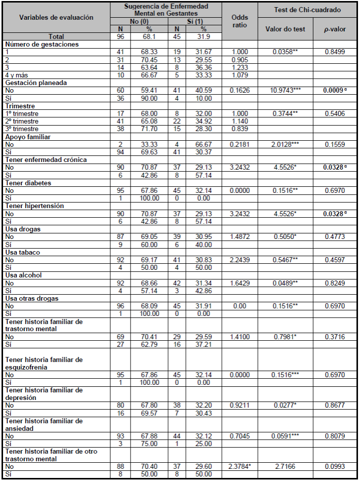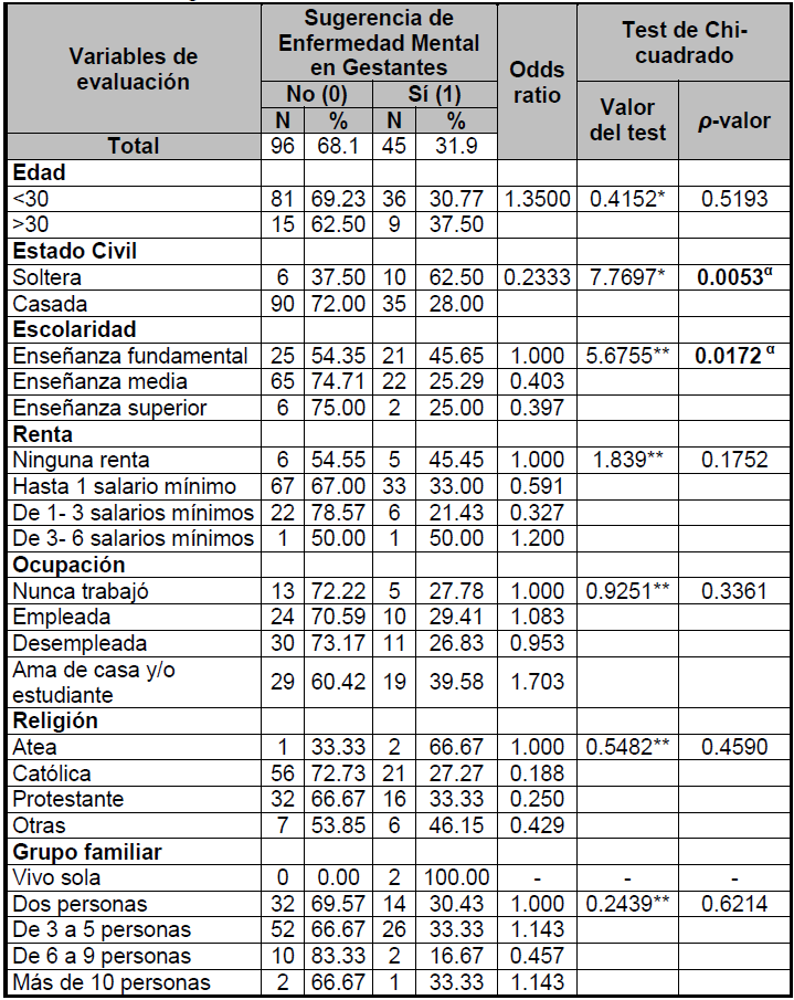 En las Tablas 2 y 3, se verifican las variables socio demográficas, gestacionales y de salud asociadas a la enfermedad mental en las participantes.