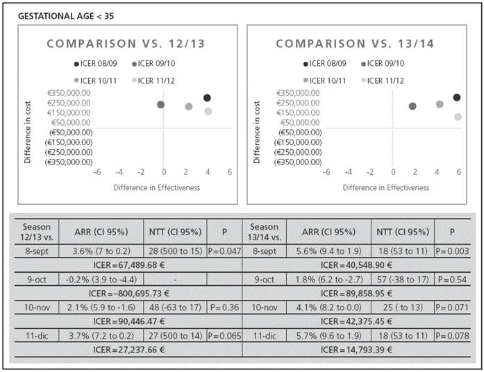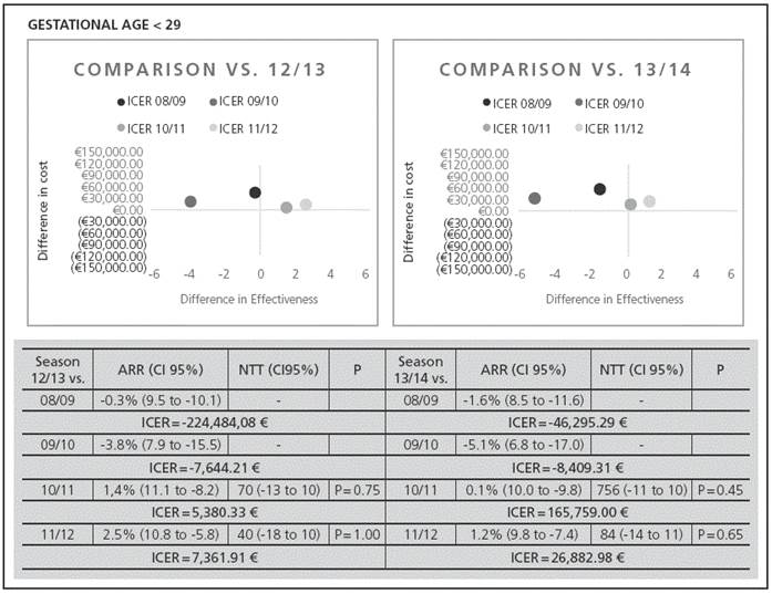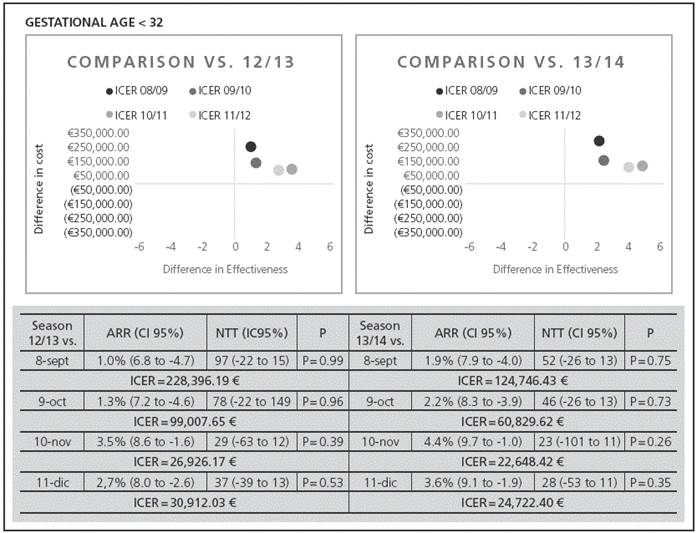 In the GA<29 range (Figure 1) for the 08/09 and 09/10 seasons vs. the 12/13 and 13/14 seasons, there was a negative result, derived of a higher hospitalization rate with the extended protocol vs. the protocol by consensus. The mean ICER for evaluable data was 51,346.06€ (range: 5,380.33€ to 165,759.00€). For the GA<32 (Figure 2), the mean ICER was 77,273.61€ (range: 22,648.42€ to 228,396.19€).