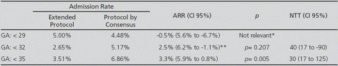 There was no statistical significance estimated for GA <29, because the hospitalization rate was lower for the protocol by consensus than for the extended protocol. For GA< 32, the confidence interval of ARR included zero, and therefore had no statistical significance; one of the NTT limits was negative, therefore including patients for whom the extended protocol was beneficial and those for whom it was detrimental.