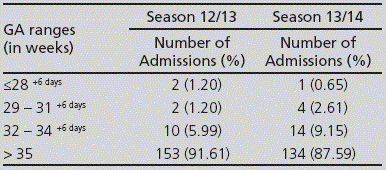The following are the data collected prospectively from patients hospitalized for bronchiolitis due to RSV in the 12/13 and 13/14 seasons (data between brackets are for the 13/14 season). The number of admissions due to RSV was of 167 (153) patients. The median age in months at admission was 2(0.2-20.1) (2(0.5-18.1)), with 63.47% (63.40 %) of admissions for <3-month-old infants; Table 3. Regarding the distribution by gender, 58% (50.33%) were male. The mean weight of patients in grams was 2.990g±752 (2.930g±930). The mean GA in weeks was 38±3.00 (38.37±2.88), where 91.62% (87.58%) of patients presented a GA> 35 weeks; there is a description in Table 4 of the number of patients according to their GA.
