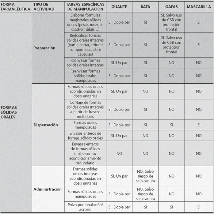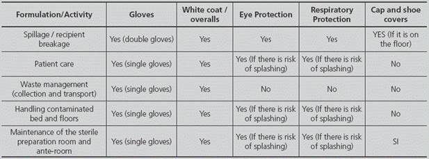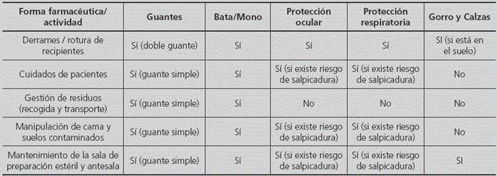 En apartados anteriores de este protocolo se han establecido las necesidades en cuanto a la utilización de Equipos de Protección Individual en función de cada medicamento (Apéndice 2 y Apéndice 3).