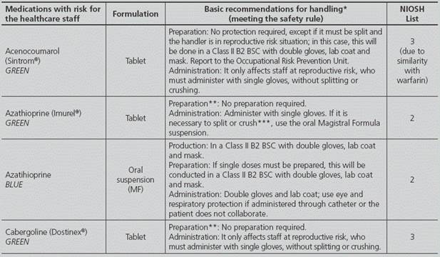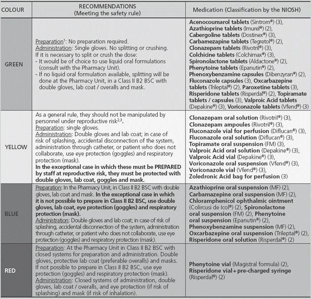 Conclusions: The development and implementation of specific safety-work processes dealing with medication handling, allows hospital managers to accomplish effectively with their legal obligations about the area of prevention and provides health-care professional staff with the adequate techniques and safety equipment to avoid possible dangers and risks of some drugs.