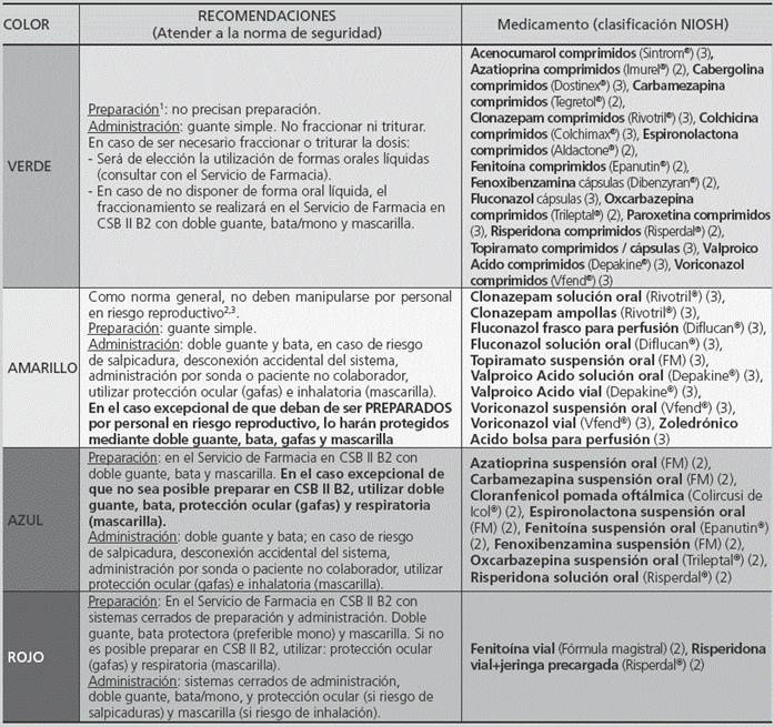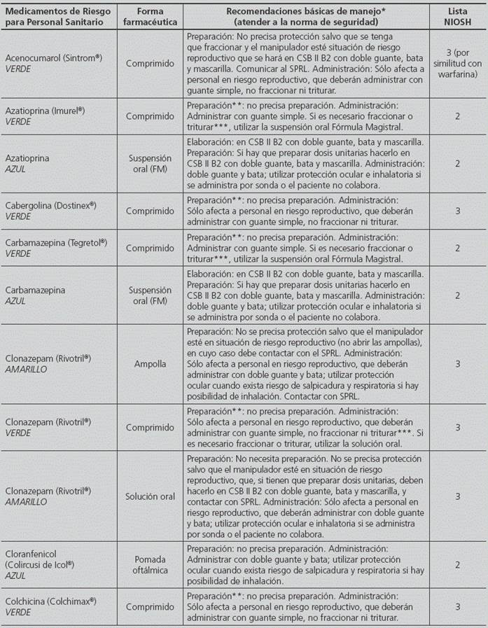 Finally, based on the classification of each HD in the NIOSH lists4,5, their formulation, and the Technical Document by the INSHT: “Hazardous Drugs: Prevention measures for their preparation and administration”6, a list was prepared with all HDs and the specific handling recommendations for each one of them (Appendix 2).