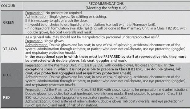 Classification of risk during preparation / administration and development of a system for identification. In order to facilitate the identification and homogeneity of HD handling, those HDs that shared handling measures during their preparation and administration were grouped into categories.