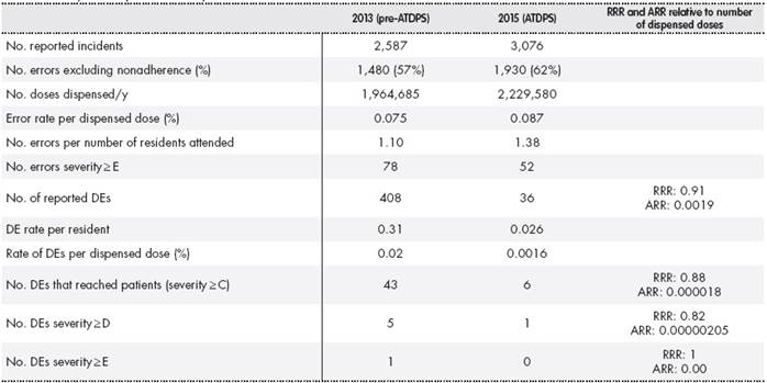 The data show that automation led to a relative reduction of 91% in reported DEs; that is, for every 1000 doses dispensed, there were 0.19 fewer DEs in 2015 (automated system) than in 2013 (pill boxes).