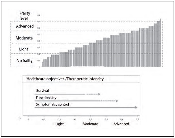 Despite this study being a first approach, the results show that the IF-CSS has discriminative capacity regarding the level of frailty. As an example of its potential usefulness, the results of the IF-CSS suggest a therapeutic approach addressing functional maintenance in the 35% of patients with moderate frailty, or a more conservative approach mainly addressing symptomatic or palliative control in the 25% of patients with advanced frailty.
