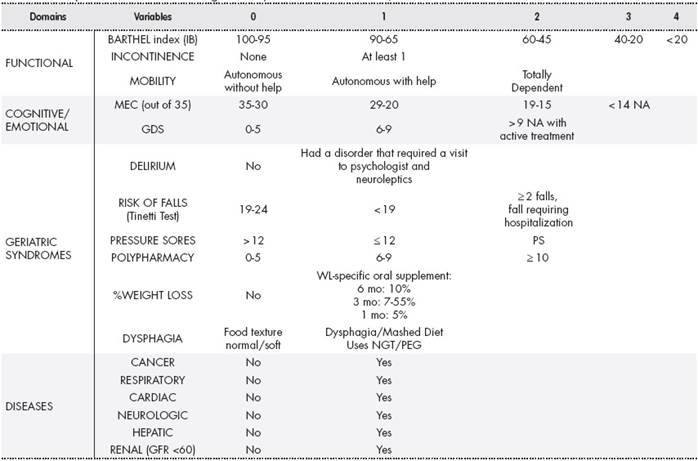 The variables and deficits were grouped into 4 domains (functional, cognitive/emotional, geriatric syndromes, and disease). The score assigned to each domain aimed at establishing weights similar to those assigned in current validated FIs2,3,5.