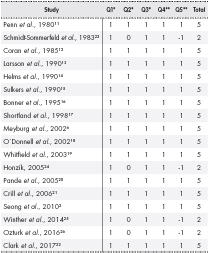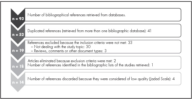 Article selection was conducted independently by two of the authors of this present review. Any discrepancies detected were solved through discussion, and in case that consensus was not reached, a third evaluator was asked to participate. The methodological quality of the studies was analyzed through the Jadad Scale or Oxford Quality Scoring System, a critical reading tool with 5 questions associated with clinical trial analysis, which classifies the study as of low quality if its score is below 3, and considers rigorous a randomized clinical trial with a score of 510.