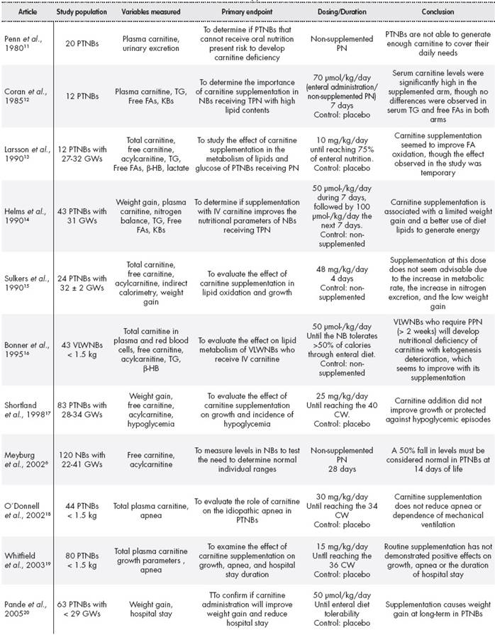 The study population in different articles was very heterogeneous, though they were all PTNBs. Almost all studies coincided in the analytical variables measured (free carnitine and acylcarnitine, triglycerides, free fatty acids and ketonic bodies). Besides, some studies such as those by Whitfield et al.19 and Pande et al.20, took into account other clinical variables, such as weight gain or apnea. In the majority of the studies, carnitine was added to the PN solution as long as there was tolerability to enteral administration, and at this time supplementation became oral. Only some studies had no supplements administered, such as the one by Meyburg et al.6, where only plasma levels were measured in order to compare them with those in FTNs. Supplement administration was conducted for a short term (<4 weeks), except in the study by Crill et al.21, with an 8-week duration.