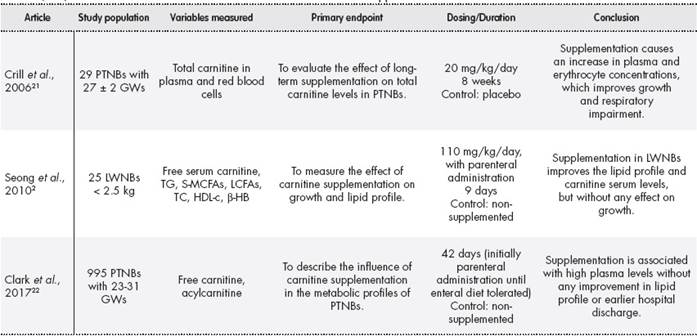 The limitations of this review lie in the different designs of different studies, as well as in the carnitine doses used (a range of 8 to 48 mg/ kg/day), or duration of the supplementation. It would be convenient to conduct studies that are more homogeneous in terms of design, as well as to analyze the need for supplementation in those newborns requiring long-term PN.