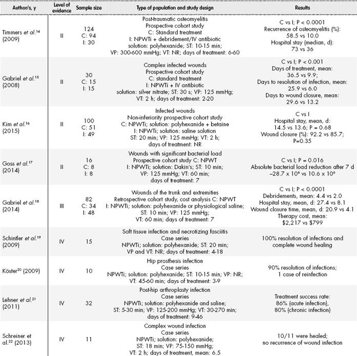 In the cohort studies, NPWTi therapy (solutions: silver nitrate or polyhexanide) was compared with standard treatment (debridement, moist wound healing, oral and/or intravenous antibiotic therapy) or NPWT. In terms of efficacy and safety, comparative studies showed statistical significance towards instillation therapies (NPWTi), regarding clinical variables such as infection recurrence14, length of hospital stay14,16,18, time for wound healing15,18 or the absolute reduction in bacterial load in the infection bed17. Specifically, the study by Gabriel et al.18 (n=82) appears interesting; besides efficacy and safety, there was also an evaluation of NPWTi therapy (with polyhexanide or saline) vs. NPWT, and the conclusion was favorable to therapy with instillation.
