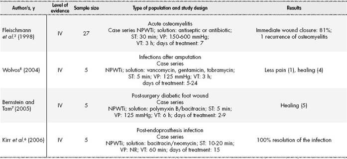 Method: A literature search was conducted to compare the available evidence regarding effectiveness, safety and efficiency of negative pressure therapy with instillation, as well as the existence of consensus guidelines for use. The articles were classified according to the “Scale of evidence classification for therapeutic studies” of the American Society of Plastic and Reconstructive Surgery.