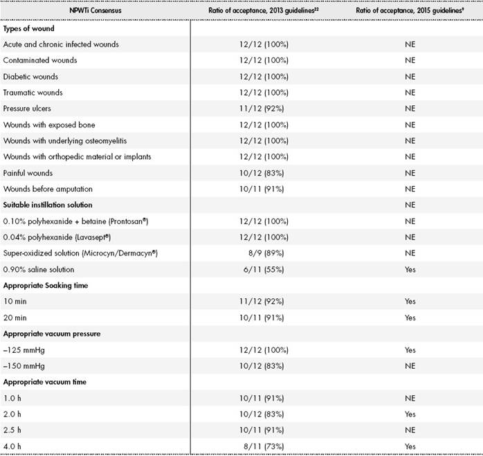 According to the 2013 consensus22, NPWTi would be appropriate for different types of wounds (Table 3). Regarding instillation solutions, the 2013 recommendations supported the use of polyhexanide and hydrogen peroxide, whereas the 2015 recommendations supported the instillation of physiological saline solution. The 2013 recommendations established a VP of -125 mmHg to -150 mmHg, whereas the 2015 recommendations suggested a VP of -125 mmHg alone. The recommended VT varied between 1 hour and 4 hours, but consensus was achieved on an ST of 10 minutes to 20 minutes (see Table 3).