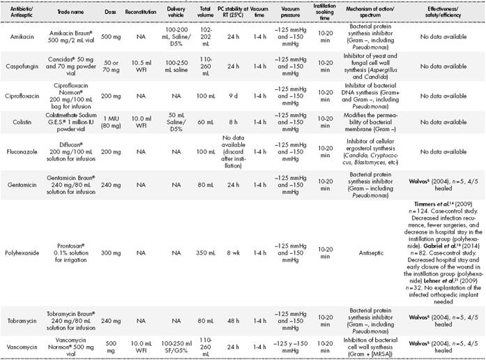 According to reported experience, the antiseptic solutions most commonly used were polyhexanide (0.005%-0.040% solution), acetic acid (0.25%-1.00% solution), and povidone-iodine (10% solution)5. Regarding antibiotic instillation, several authors have reported the use of bacitracin/ neomycin6, polymyxin B/bacitracin7, vancomycin, gentamicin, and tobramycin8. In the United States, their use in NPWTi therapy is considered to be off-label9. The antimicrobial action of the instilled antibiotics or antiseptics is assumed to be local on the wound bed, with no evidence of systemic absorption.
