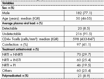 Regarding pharmacotherapeutic endpoints: HCV and/or HBV confections; type of ART therapy (classified as (a) two nucleoside reverse transcriptase inhibitors (NRTI) plus a non-nucleoside reverse transcriptase inhibitor (NNRTI), (b) two NRTI plus a protease inhibitor (PI), (c) two NRTIs plus an integrase strand transfer inhibitor (INSTI) and (d) others16); number of concomitant medications (only was considered if it was prescribed with a minimum duration of 60 days); polymedicated (defined as a treatment with five or more drugs, including ART17); adherence to ART and concomitant treatment and complexity index by MRCI18 and a VAS19.