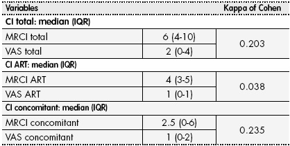 In relations with the main variables, there was a discrete concordance between the complexity index total and concomitant by MRCI and the patients’ perceived complexity (VAS) however there was not a concordance between the complexity index of ART by MRCI and the patients’ perceived complexity (Table 2).