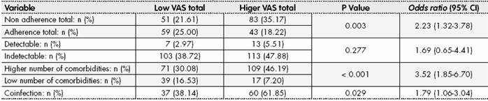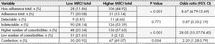 The non-adherence of total medication was associated with higher complexity index. The non-adherence in patients with the high MRCI index was 44.92% (p < 0.001) and with high VAS scale was 35.17% (p = 0.003). Furthermore, there were also statistically significant differences between coinfected patients with higher complexity index (MRCI 69.07%; p = 0.004), and VAS scale (61.85%; p = 0.029). Last, the higher number of comorbidities was associated with higher complexity index: MRCI (55.93%; p < 0.001) and VAS scale (46.19%; p < 0.001) (Tables 3 and Table 4).