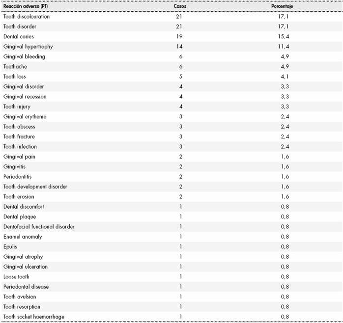 No se encontraron casos similares en la base de datos de la Agencia Española de Medicamentos y Productos Sanitarios (AEMPS): Farmacovigilancia Española, Datos de Reacciones Adversas (FEDRA®). Se analizó la base de datos de la Organización Mundial de la Salud, VigiBase™, encontrándose descritas 37.747 RAM para metilfenidato; 123 para el High-Level Group Term (HLGT) “alteraciones dentales y gingivales”, de las cuales 39 correspondían a niños de entre 2 y 11 años (31,7%). De los 123 casos, 21 (17,1%) se correspondían con el Preferred Term (PT) “decoloración dental”, siendo 14 (35,9%) en el grupo de niños de 2-11 años. El número total de casos de tinción dental podría estar infraestimado debido a la gran cantidad de PT existentes que engloban RAM dentales inespecíficas; como “trastorno dental” con 21 casos (17,1%) en población general y 6 casos (15,4%) en el segundo grupo, entre otros. En la Tabla 1 se pueden ver los diferentes PT de alteraciones dentales y gingivales recogidos para metilfenidato. Se ha descrito algún caso aislado de coloración amarillenta, pudiendo estar en relación con el cambio de color del E-132 en función del pH (azul a pH 11,4 y amarillo a pH 13)4.