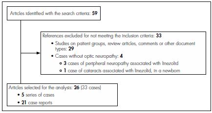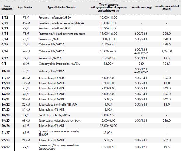 Results: A total of 33 cases from 26 independent articles were analyzed. The mean age was 44.97 ± 21.40 years (range: 6-79) and 16 (50%) of 32 cases were women. The duration of treatment with linezolid until onset of symptoms was greater than 28 days in 29 (90.6%) of 32 documented cases. The mean time of exposure to onset of symptoms was 8.5 ± 8.6 months (range: 0.33-50). A total of 12 of 26 adult patients received linezolid 600 mg/24 h, starting. In 30 (90.9%) patients loss of visual acuity was documented. Linezolid was withdrawn in all cases once the diagnosis was confirmed, with clinical improvement in 31 (93.9%) cases.
