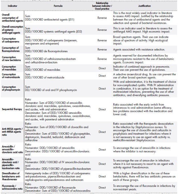 The selection of indicators was based on prioritizing the consumption of the agents of choice in the main infections described in guidelines and protocols of reference, on reducing the use of antimicrobial agents in general, and of those with broad spectrum in particular, due to the impact on selection and spread of resistances, as well as on the application of measures for therapeutic adaptation and simplification, such as de -escalation strategy that replace empiric treatment by the narrowest possible spectrum agent, or the sequential therapy with the switch from intravenous to oral administration.