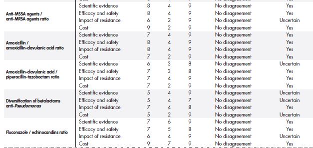 The panel of experts was requested to qualify the relevance of each proposed indicator in four dimensions: Scientific evidence, efficacy and safety for patients, increase in microbial resistances, and cost for the health system.