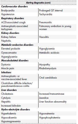 The most frequent response was treatment interruption (65%), followed by no change (25.2%), and dose modification (9.8%). The patients received additional specific treatment in 56% of cases.