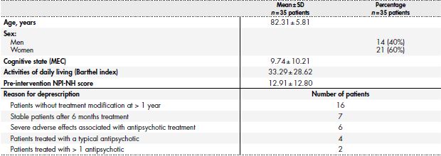 Resultados: Se elaboró un protocolo que incluye criterios de prescripción y desprescripción de antipsicóticos. La intervención se realizó sobre 35 pacientes, 21 (60%) de las cuales eran mujeres. La retirada del tratamiento antipsicótico fue completa en 28 pacientes (80%) y se redujo a la mínima dosis eficaz en 7 (20%). El tratamiento se reinició en 2 pacientes por agravamiento de los síntomas. Los resultados de la evaluación conductual previa y a los 6 meses indicaron que no se produjeron modificaciones significativas en dichas alteraciones (12,91 ± 12,80 frente a 13,76 ± 16,68; p = 0,124).