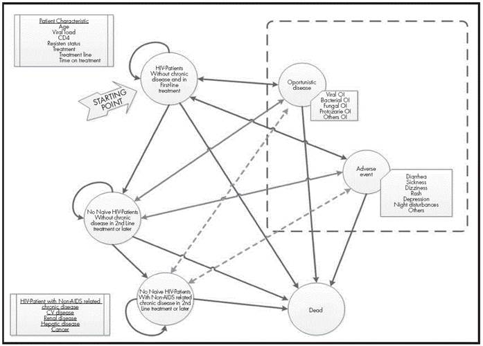 Each month throughout the simulation and depending on the treatment received, the changes in patient characteristics are determined and if these changes cause the individual to remain in the initial state or change to a new one. These changes are determined by the probability of disease pro-gression, occurrence of opportunistic infections and/or adverse effects, and occurrence of long-term chronic diseases and death. All these probabilities are determined by the CD4+ count the patient has at the start of each cycle.