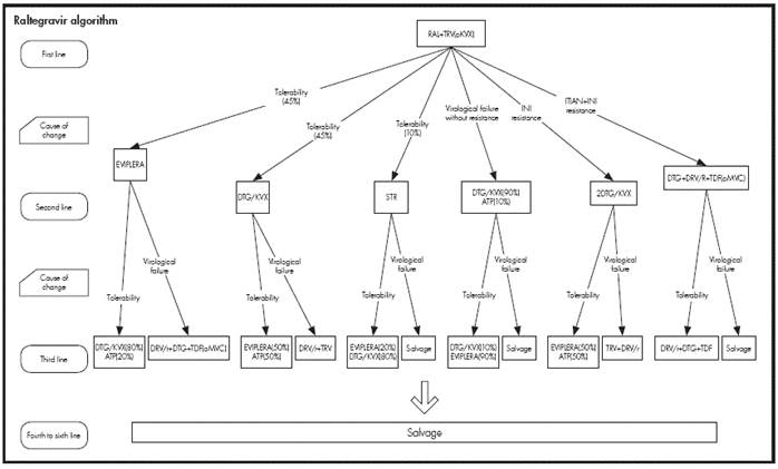 As shown in Figure 2a, Figure 2b, Figure 2c, Figure 2d, an expert panel determined the four treatment algorithms, one for each initial treatment. The choice of treatment in the second and subsequent lines was made attempting to prevent problems of tolerability and resistance that could compromise efficacy. The model took into account resistance to NRTIs, NNRTIs, and INI.
