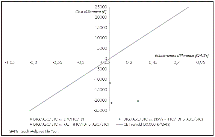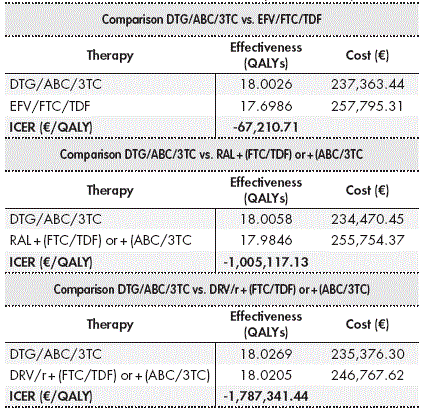 Results: Treatment initiation with DTG/ABC/3TC was dominant when it was compared with treatment initiation with all the comparators: vs. FTC/TDF/EFV (-67 210.71€/QALY), vs. DRV/r + FTC/TDF or ABC/3TC (-1 787 341.44€/QALY), and vs. RAL + FTC/TDF or ABC/3TC (-1 005 117.13€/QALY). All the sensitivity analyses performed showed the consistency of these findings.
