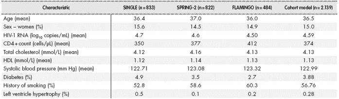 Initially patients were described with demographic variables (age, sex), disease defining parameters (plasma viral load, CD4+ cell count), and co-variates used for measuring cardiovascular risk in the Framingham equation (systolic pressure, total cholesterol, high- density lipoprotein (HDL) choleste-rol, history of smoking, diabetes and left ventricular hypertrophy).