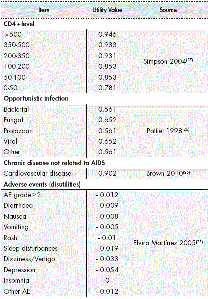 The efficacy of treatment alternatives was measured as life years gained (LYG) and quality-adjusted life years (QALYs) by applying the corresponding utilities associated with CD4+ level, having an opportunistic infection and its sequelae, having an adverse event and those associated with chronic diseases not related to AIDS. These utilities shown in Table 2 were obtained from the literature7,21-24.