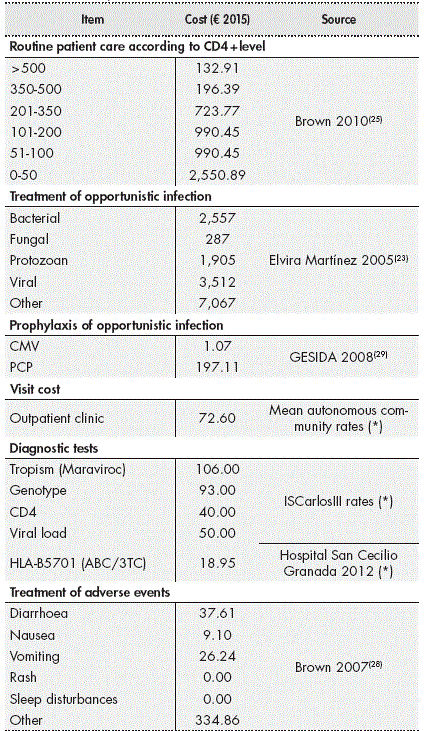 Thus, standard patient care costs were considered such as those derived from medical visits, diagnostic tests, management of adverse events, care of chronic diseases and drug costs of antiretroviral therapy and prophylaxis and treatment of opportunistic infections.